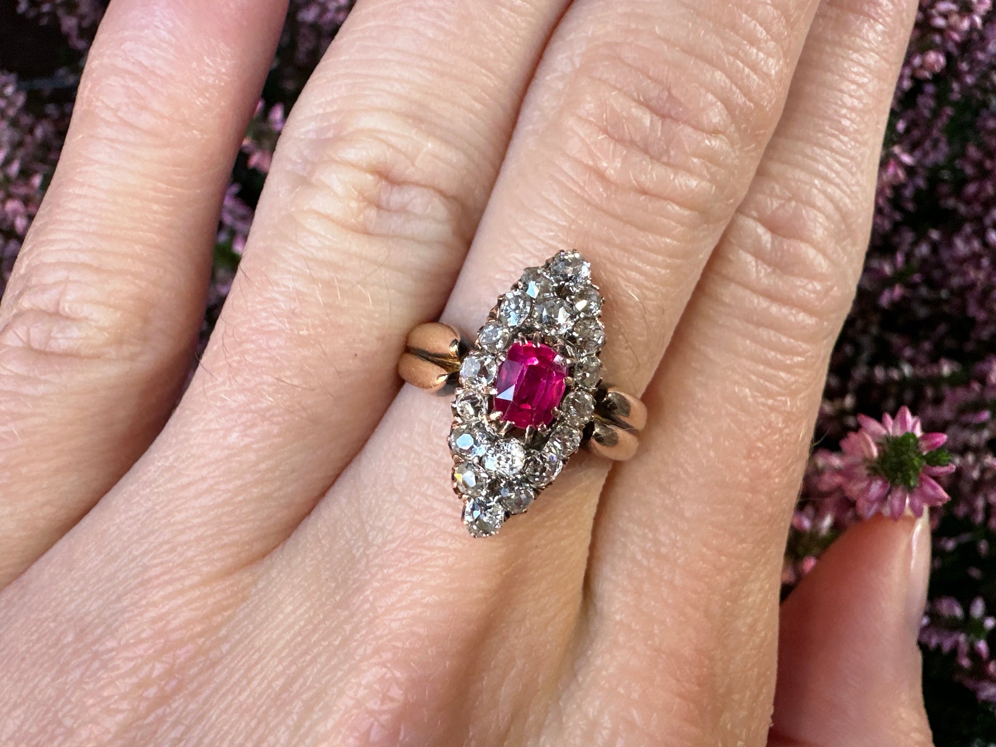A breathtaking example of late Victorian craftsmanship, this original navette-shaped cluster ring features a WGI certified 0.59ct unheated Burmese ruby, displaying a vivid, glowing purplish red with beautifully saturated color. The ruby is hand-cut in a cushion-oval shape, secured in period prongs, and tested as natural, unheated corundum of Burmese origin, a rarity in antique jewelry and highly sought after by collectors.