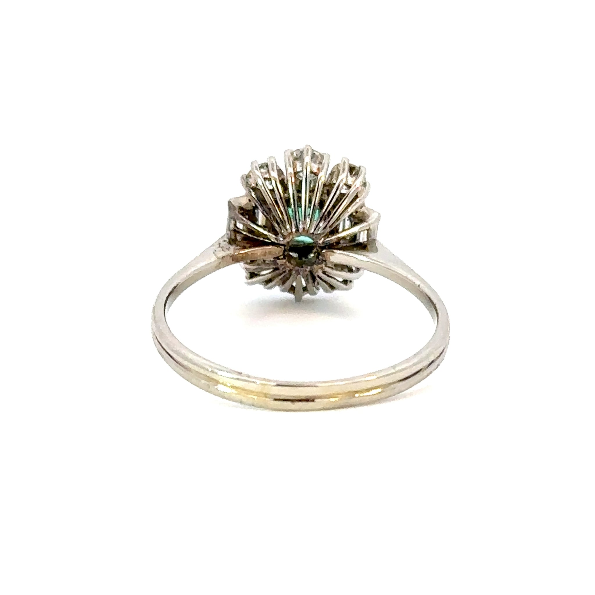 A refined vintage emerald and diamond ring in 18k white gold, featuring a vibrant Colombian emerald surrounded by sparkling diamonds.