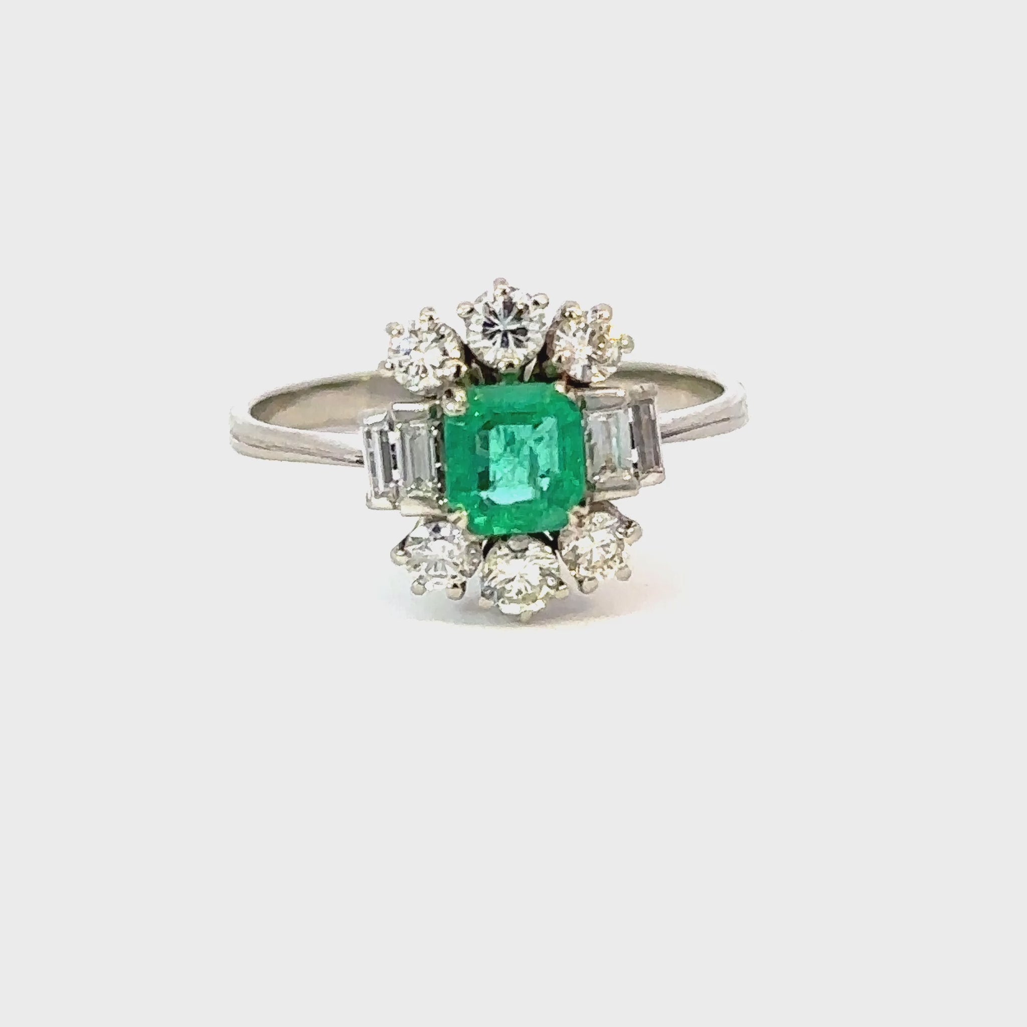 At the center lies a 0.50ct natural emerald in an elegant octagonal step cut, displaying a lively green hue enhanced by its crisp geometry. The emerald is framed by six round brilliant cut and four baguette cut diamonds (approx. 0.55ctw), their fire and brilliance forming a striking contrast against the rich green center. Certified and full of character, this ring carries timeless sophistication and vintage charm.