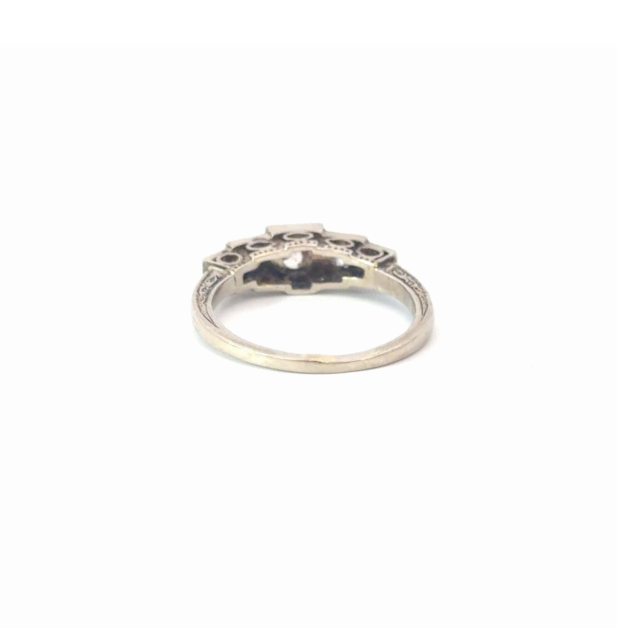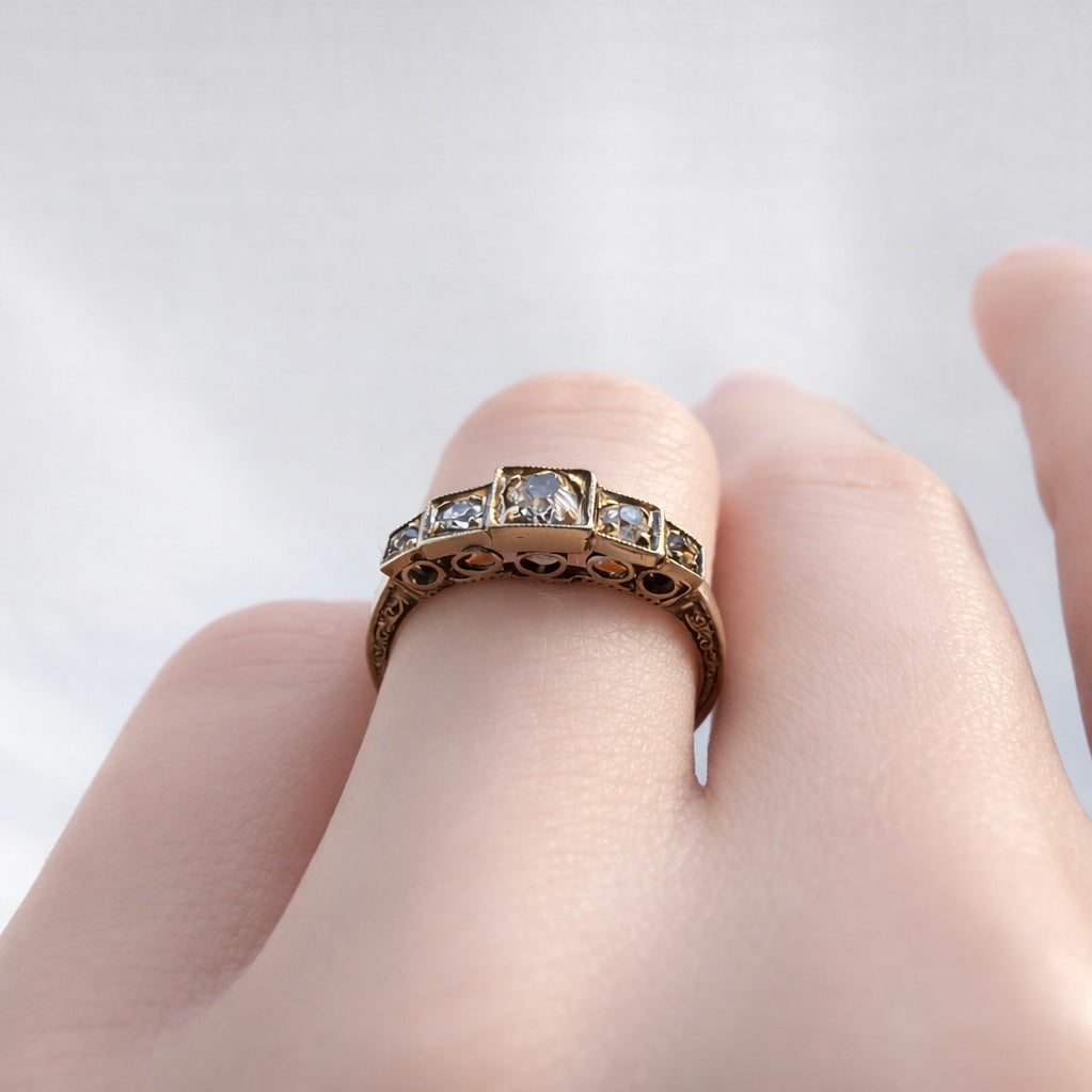 Set with natural old-cut diamonds totaling approximately 0.30 carats, the stones show the soft, romantic sparkle typical of antique cuts. Diamonds are J–L color, VS–SI clarity, with age-appropriate wear, consistent with an authentic antique ring.
